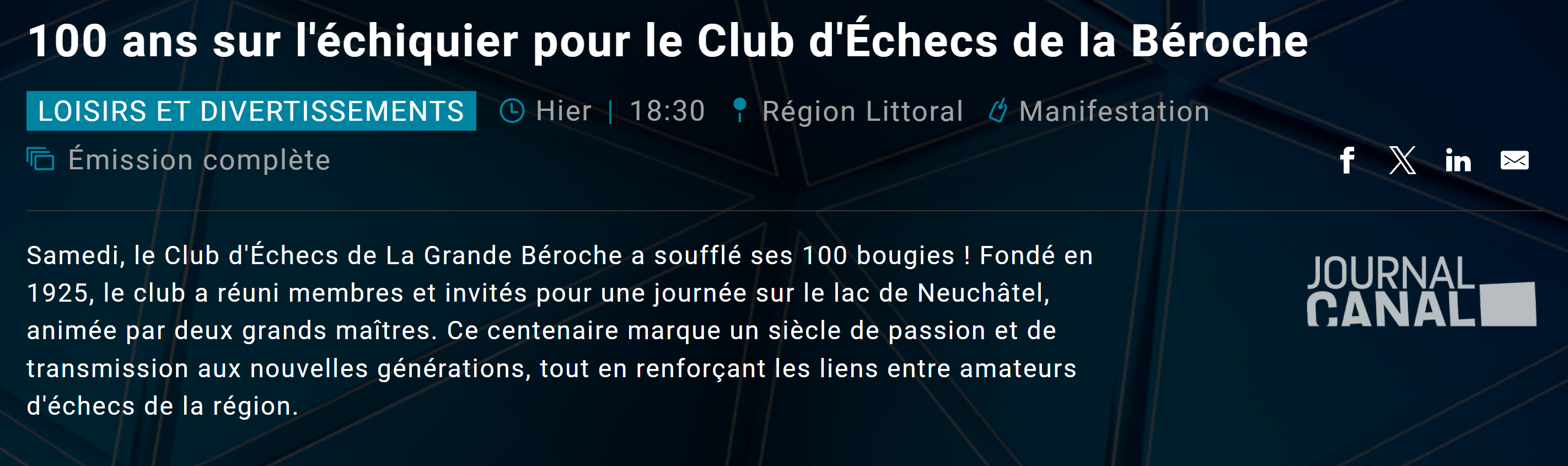 Un grand merci pour tout le travail incroyable que vous avez accompli pour organiser ce jubilé du 100ème anniversaire du club d'échecs de la Béroche.